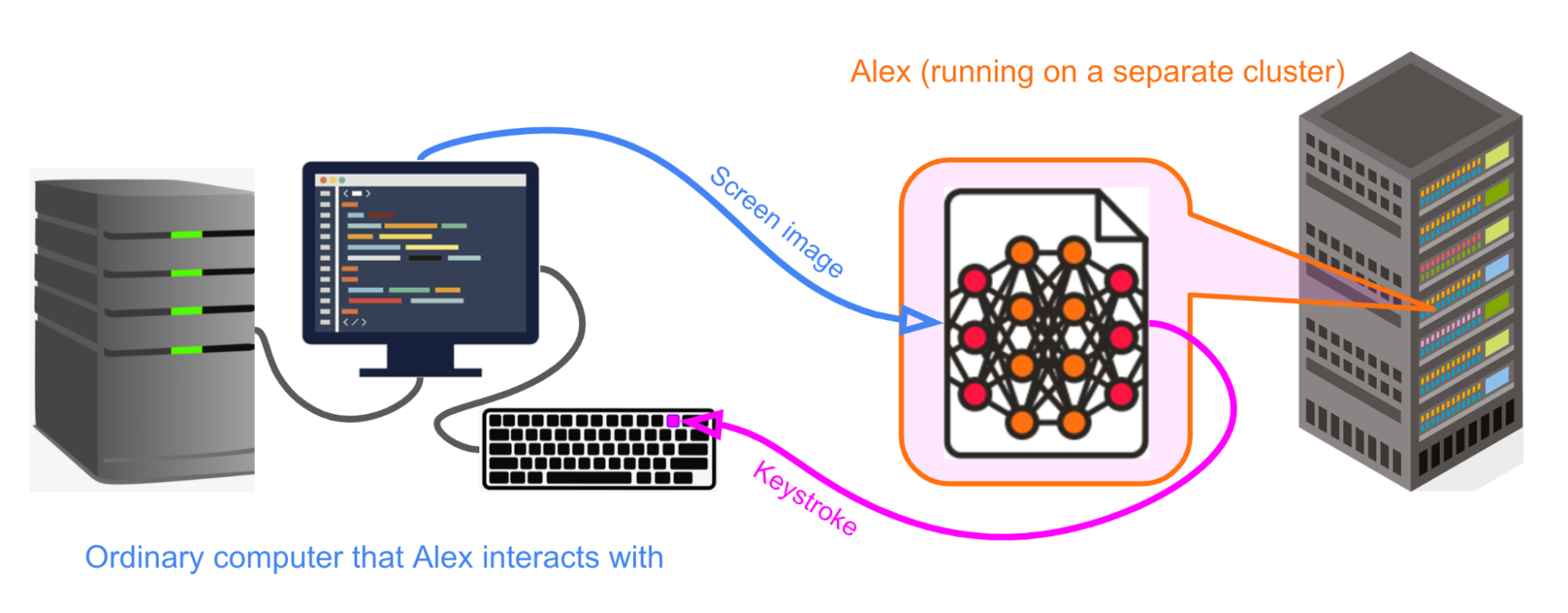 For simplicity and concreteness, we can pretend that interacting with the computer works exactly as it does for a human.[13] That is, we can pretend Alex simply takes an image of a computer screen as input and produces a keystroke[14] on an ordinary keyboard as output.