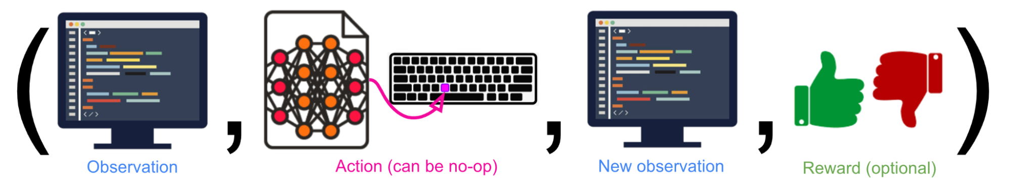 - An action (such as a keystroke). The action space includes a no-op and encompasses every low-level action a human could take on a computer.