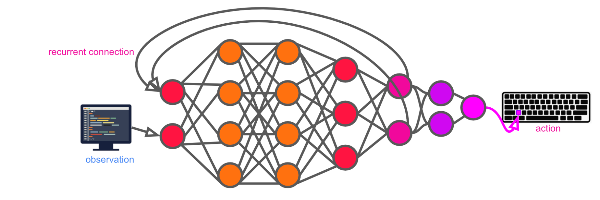 In reality, I expect it would have multiple input and output channels which use special format(s) more optimized for machine consumption, rather than having just one input channel which is directly analogous to human vision and one output channel which is directly analogous to human typing — those are probably not the most efficient way for a neural network to interact with external computers. Going forward, I’ll simply refer to inputs as observations and outputs as actions, though I’ll use the shorthand of “screen image” and “keystroke” in the diagrams. ↩︎