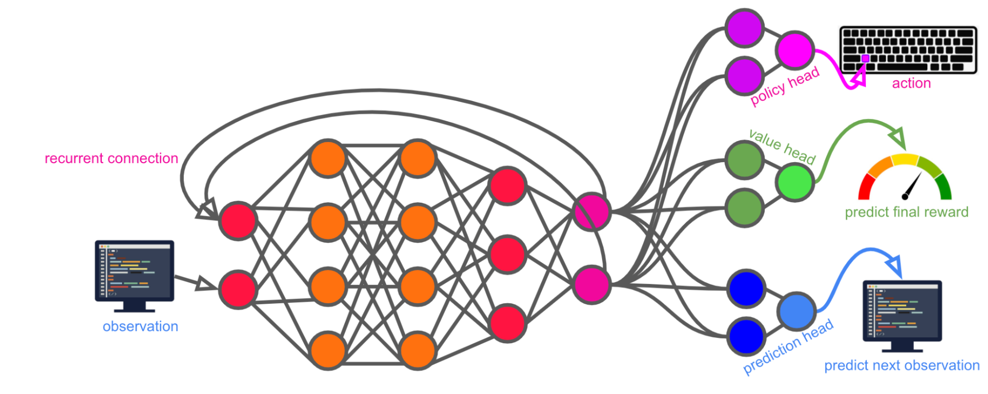 Let’s say it also outputs a prediction of the next observation[52] and the final episode reward (both conditional on taking the action) as auxiliary tasks every timestep. The observation prediction task is meant to help it build up an understanding of the dynamics of interacting with the computer, while the reward prediction task is meant to help it more quickly connect decisions to their impact on overall task performance.