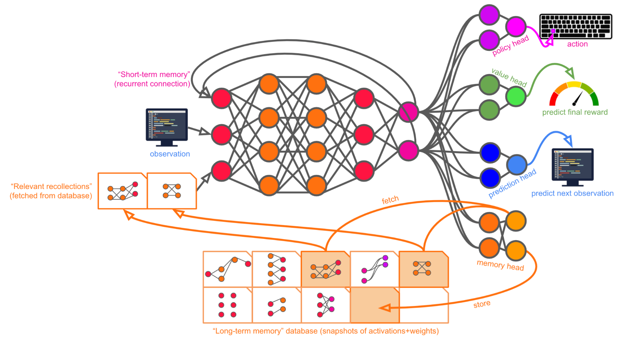 Within each timestep of an episode, Alex is able to a) store any activations and/or weights from the current timestep that it wants to, and b) send a query to retrieve any previously stored activations and/or weights that might be relevant, handing those to itself as inputs for the next timestep. Over the course of an episode, the memory bank builds up a store of “lifetime experiences” (though some experiences can also be “forgotten” if desired).