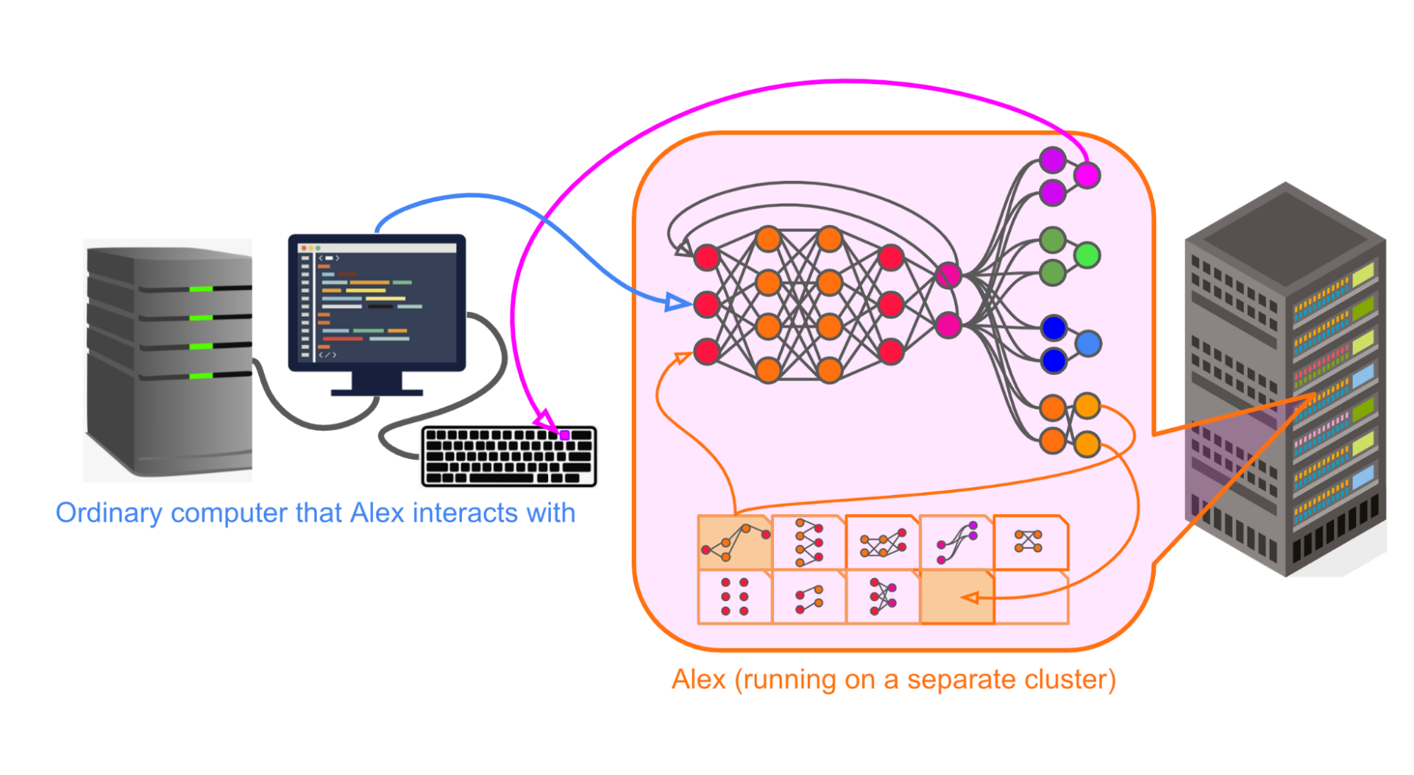 Stepping back, the high-level picture of Alex interacting with the external computer, with the details of the architecture sketched out, looks like this: