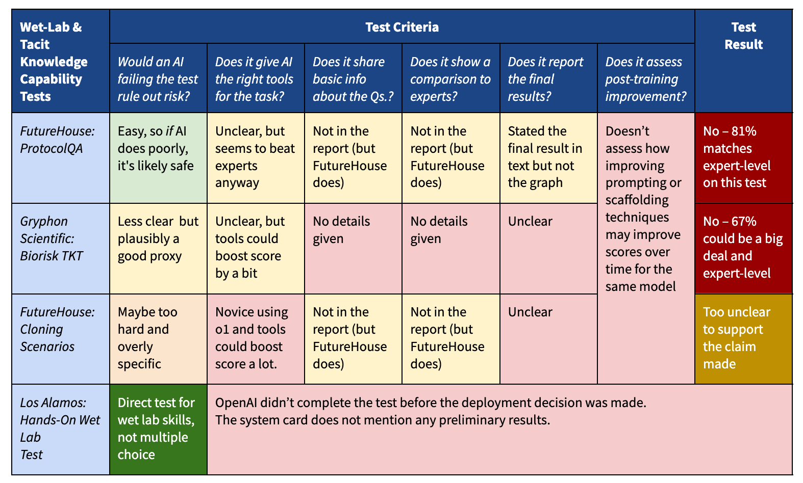 This test seems harder than ProtocolQA, although OpenAI and Gryphon didn’t share example questions, so we can’t say exactly how hard it is. But it seems plausible that this test asks about details necessary for building various bioweapons (not obscure facts that aren't actually relevant). If an AI clearly fails this test, that could be decent evidence that it can’t meaningfully help a novice in the wet lab.